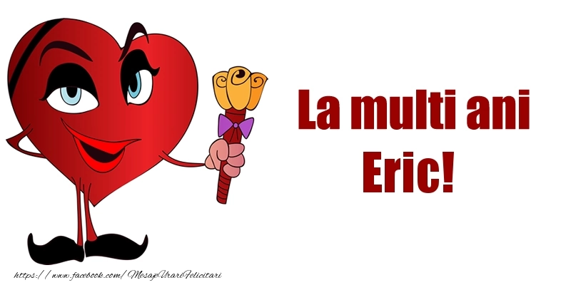 Această felicitare cu o inimoară haioasă cu un buchet în mână din colecția noastră de felicitari de la multi ani cu numele Eric are o notă de originalitate și îți oferă ocazia să faci o persoană să se simtă specială datorită faptului că acolo este numele ei. Felicitarea se poate descărca gratuit sau se poate trimite prin Whatsapp, Facebook, Twitter, Pinterest. Imagine de la mulți ani cu o inimoară haioasă cu un buchet în mână cu dimensiunile 800px x 400px și cu textul La multi ani Eric!.