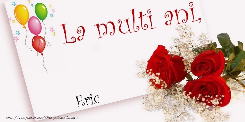 Această felicitare cu 3 trandafiri și baloane colorate din colecția noastră de felicitari de la multi ani cu numele Eric are o notă de originalitate și îți oferă ocazia să faci o persoană să se simtă specială datorită faptului că acolo este numele ei. Felicitarea se poate descărca gratuit sau se poate trimite prin Whatsapp, Facebook, Twitter, Pinterest. Imagine de la mulți ani cu 3 trandafiri și baloane colorate cu dimensiunile 800px x 400px și cu textul La multi ani, Eric.