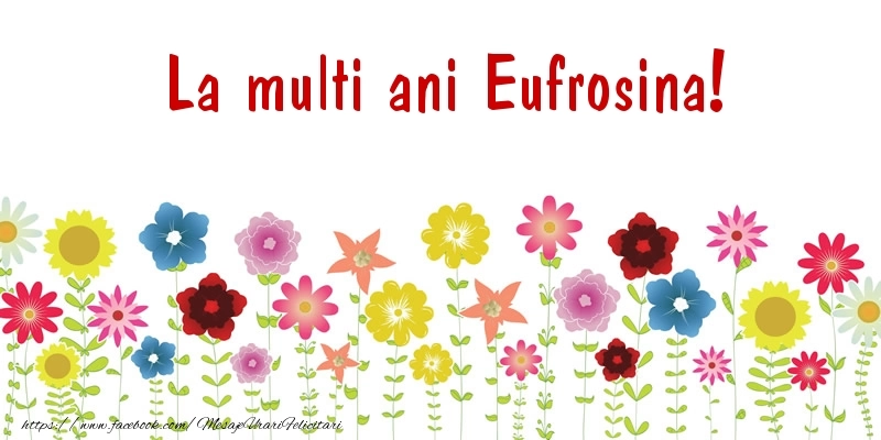 Această felicitare cu confetti și flori din colecția noastră de felicitari de la multi ani cu numele Eufrosina are o notă de originalitate și îți oferă ocazia să faci o persoană să se simtă specială datorită faptului că acolo este numele ei. Felicitarea se poate descărca gratuit sau se poate trimite prin Whatsapp, Facebook, Twitter, Pinterest. Imagine de la mulți ani cu confetti și flori cu dimensiunile 800px x 400px și cu textul La multi ani Eufrosina!.