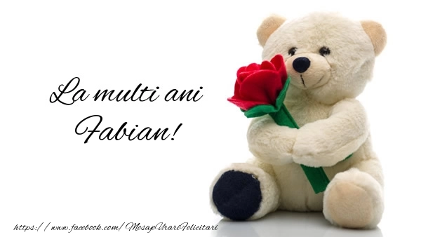 Această felicitare cu ursuleț de pluș cu un trandafir in brațe din colecția noastră de felicitari de la multi ani cu numele Fabian are o notă de originalitate și îți oferă ocazia să faci o persoană să se simtă specială datorită faptului că acolo este numele ei. Felicitarea se poate descărca gratuit sau se poate trimite prin Whatsapp, Facebook, Twitter, Pinterest. Imagine de la mulți ani cu ursuleț de pluș cu un trandafir in brațe cu dimensiunile 600px x 338px și cu textul La multi ani Fabian!.