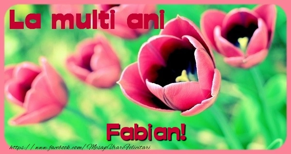 Această felicitare cu lalele pe câmp din colecția noastră de felicitari de zi de nastere cu numele Fabian are o notă de originalitate și îți oferă ocazia să faci o persoană să se simtă specială datorită faptului că acolo este numele ei. Felicitarea se poate descărca gratuit sau se poate trimite prin Whatsapp, Facebook, Twitter, Pinterest. Imagine de zi de nastere cu lalele pe câmp cu dimensiunile 600px x 319px și cu textul La multi ani Fabian.