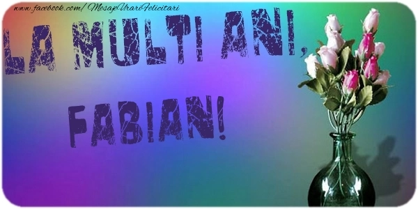 Această felicitare cu trandafiri în sticlă din colecția noastră de felicitari de la multi ani cu numele Fabian are o notă de originalitate și îți oferă ocazia să faci o persoană să se simtă specială datorită faptului că acolo este numele ei. Felicitarea se poate descărca gratuit sau se poate trimite prin Whatsapp, Facebook, Twitter, Pinterest. Imagine de la mulți ani cu trandafiri în sticlă cu dimensiunile 600px x 300px și cu textul La multi ani, Fabian.