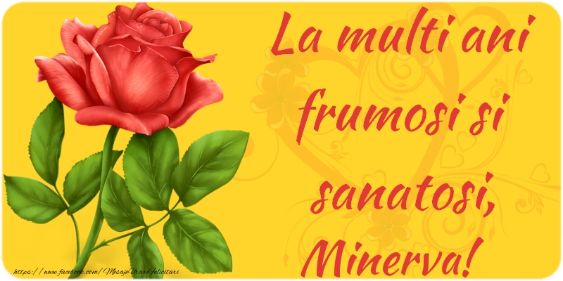 Această felicitare cu trandafir roșu pe fundal cu inimioară din colecția noastră de felicitari de zi de nastere cu numele Minerva are o notă de originalitate și îți oferă ocazia să faci o persoană să se simtă specială datorită faptului că acolo este numele ei. Felicitarea se poate descărca gratuit sau se poate trimite prin Whatsapp, Facebook, Twitter, Pinterest. Imagine de zi de nastere cu trandafir roșu pe fundal cu inimioară cu dimensiunile 800px x 400px și cu textul La multi ani fericiti si sanatosi, Minerva.