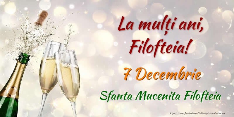 La multi ani, Filofteia! 7 Decembrie Sfanta Mucenita Filofteia | Felicitare cu șampanie care se deschide și 2 pahare | Felicitari de Ziua Numelui
