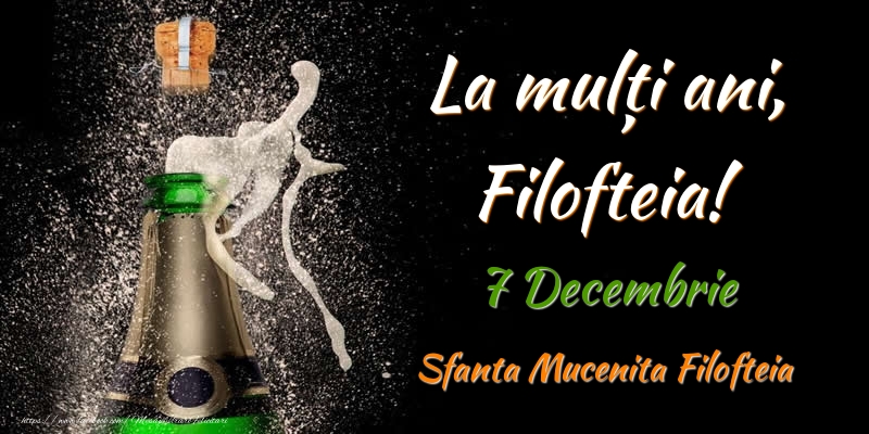 La multi ani, Filofteia! 7 Decembrie Sfanta Mucenita Filofteia | Felicitare cu sampanie pe fundal negru pentru bărbați sau femei | Felicitari de Ziua Numelui
