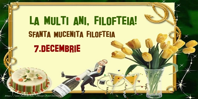 La multi ani, Filofteia! Sfanta Mucenita Filofteia - 7.Decembrie | Felicitare cu lalele galbene, șampanie și tort | Felicitari de Ziua Numelui