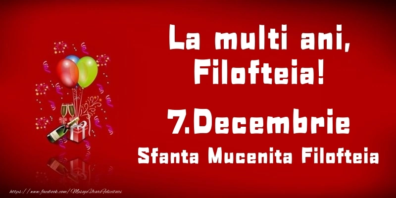 La multi ani, Filofteia! Sfanta Mucenita Filofteia - 7.Decembrie | Felicitare cu baloane și șampanie pe fundal roșu aprins | Felicitari de Ziua Numelui