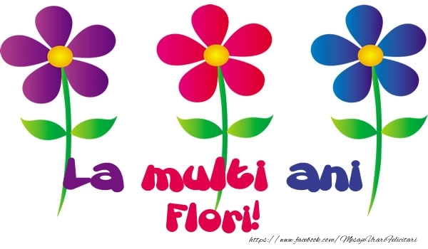 Această felicitare cu 3 flori haioase din colecția noastră de felicitari de la multi ani cu numele Flori are o notă de originalitate și îți oferă ocazia să faci o persoană să se simtă specială datorită faptului că acolo este numele ei. Felicitarea se poate descărca gratuit sau se poate trimite prin Whatsapp, Facebook, Twitter, Pinterest. Imagine de la mulți ani cu 3 flori haioase cu dimensiunile 600px x 350px și cu textul La multi ani Flori!.