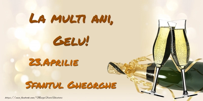 Această felicitare cu șampanie și 2 pahare din colecția noastră de felicitari de ziua numelui cu numele Gelu are o notă de originalitate și îți oferă ocazia să faci o persoană să se simtă specială datorită faptului că acolo este numele ei. Felicitarea se poate descărca gratuit sau se poate trimite prin Whatsapp, Facebook, Twitter, Pinterest. Imagine de ziua onomastică cu șampanie și 2 pahare cu dimensiunile 800px x 400px și cu textul La multi ani, Gelu! 23.Aprilie - Sfantul Gheorghe.