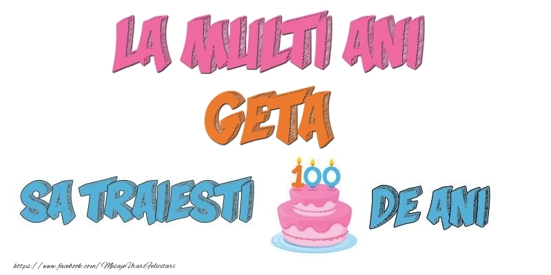 Această felicitare cu tort cu 100 din colecția noastră de felicitari de zi de nastere cu numele Geta are o notă de originalitate și îți oferă ocazia să faci o persoană să se simtă specială datorită faptului că acolo este numele ei. Felicitarea se poate descărca gratuit sau se poate trimite prin Whatsapp, Facebook, Twitter, Pinterest. Imagine de zi de nastere cu tort cu 100 cu dimensiunile 800px x 400px și cu textul La multi ani, Geta! Sa traiesti 100 de ani!.