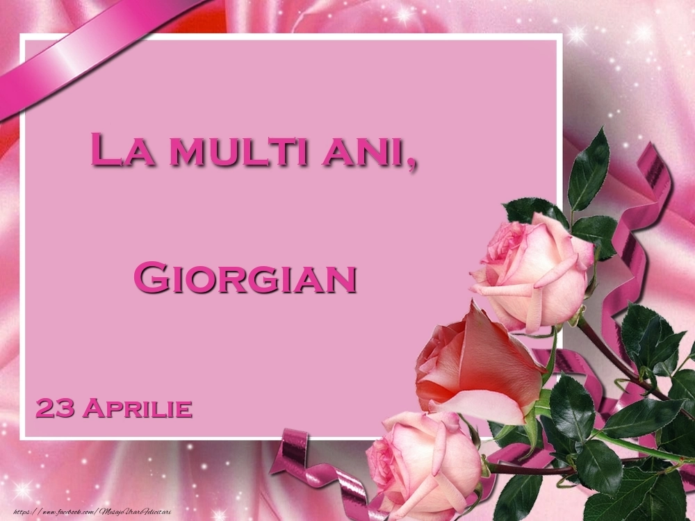 Această felicitare cu aranjament cu 3 trandafiri din colecția noastră de felicitari de ziua numelui cu numele Giorgian are o notă de originalitate și îți oferă ocazia să faci o persoană să se simtă specială datorită faptului că acolo este numele ei. Felicitarea se poate descărca gratuit sau se poate trimite prin Whatsapp, Facebook, Twitter, Pinterest. Imagine de ziua onomastică cu aranjament cu 3 trandafiri cu dimensiunile 1000px x 750px și cu textul La multi ani, Giorgian! 23 Aprilie.