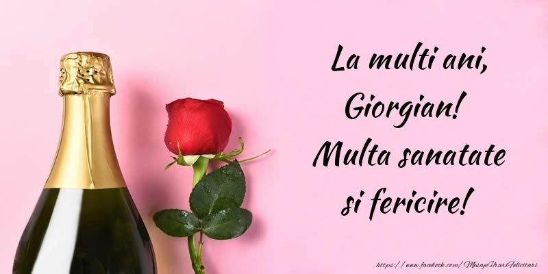 Această felicitare cu 1 trandafir și 1 șampanie din colecția noastră de felicitari de la multi ani cu numele Giorgian are o notă de originalitate și îți oferă ocazia să faci o persoană să se simtă specială datorită faptului că acolo este numele ei. Felicitarea se poate descărca gratuit sau se poate trimite prin Whatsapp, Facebook, Twitter, Pinterest. Imagine de la mulți ani cu 1 trandafir și 1 șampanie cu dimensiunile 800px x 400px și cu textul La multi ani, Giorgian! Multa sanatate si fericire!.