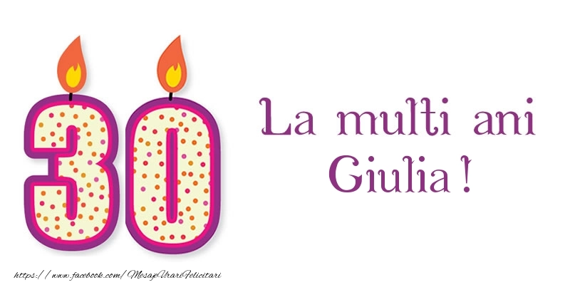 Această felicitare cu lumânări pentru 30 de ani din colecția noastră de felicitari de zi de nastere cu numele Giulia are o notă de originalitate și îți oferă ocazia să faci o persoană să se simtă specială datorită faptului că acolo este numele ei. Felicitarea se poate descărca gratuit sau se poate trimite prin Whatsapp, Facebook, Twitter, Pinterest. Imagine de zi de nastere cu lumânări pentru 30 de ani cu dimensiunile 800px x 400px și cu textul La multi ani Giulia! 30 de ani.