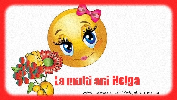 Această felicitare cu emoticoană draguță și flori din colecția noastră de felicitari de la multi ani cu numele Helga are o notă de originalitate și îți oferă ocazia să faci o persoană să se simtă specială datorită faptului că acolo este numele ei. Felicitarea se poate descărca gratuit sau se poate trimite prin Whatsapp, Facebook, Twitter, Pinterest. Imagine de la mulți ani cu emoticoană draguță și flori cu dimensiunile 600px x 341px și cu textul La multi ani Helga!.