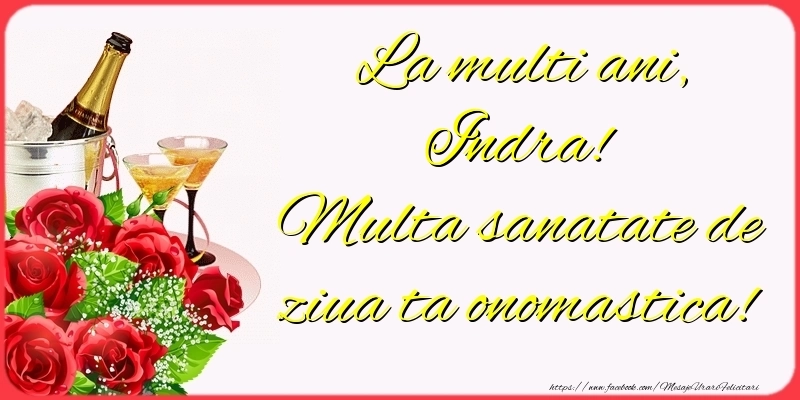 La multi ani, Indra! Multa sanatate de ziua ta onomastica! | Felicitare cu șampanie în frapieră și trandafiri cu scris galben | Felicitari de Ziua Numelui