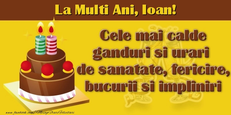 Această felicitare cu tort pentru femei sau bărbați din colecția noastră de felicitari de la multi ani cu numele Ioan are o notă de originalitate și îți oferă ocazia să faci o persoană să se simtă specială datorită faptului că acolo este numele ei. Felicitarea se poate descărca gratuit sau se poate trimite prin Whatsapp, Facebook, Twitter, Pinterest. Imagine de la mulți ani cu tort pentru femei sau bărbați cu dimensiunile 800px x 400px și cu textul La multi ani, Ioan!.