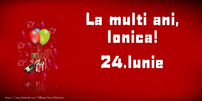 La multi ani, Ionica!  - 24.Iunie | Felicitare cu baloane și șampanie pe fundal roșu aprins | Felicitari de Ziua Numelui
