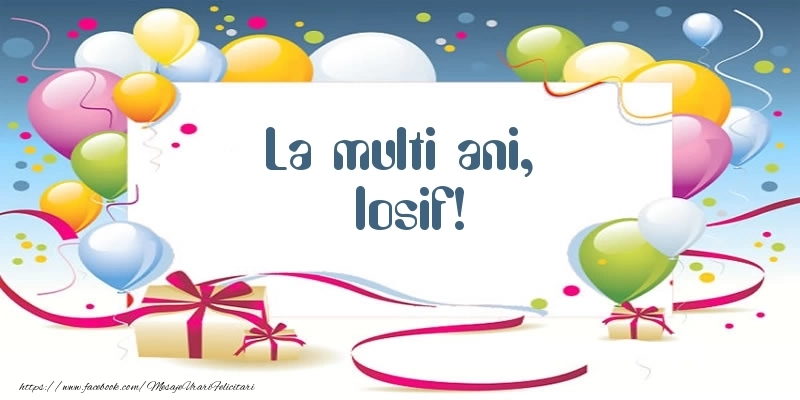 Celebrează ziua specială a cuiva drag pe nume Iosif cu această felicitare plină de energie și culoare! Felicitarea cu baloane colorate și cadouri se poate descărca gratuit sau se poate trimite prin Whatsapp, Facebook, Twitter, Pinterest. Imaginea are dimensiunile 800px x 400px și textul La multi ani, Iosif!.
