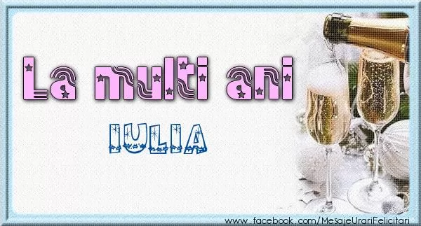 Această felicitare cu șampanie în pahare din colecția noastră de felicitari de zi de nastere cu numele Iulia are o notă de originalitate și îți oferă ocazia să faci o persoană să se simtă specială datorită faptului că acolo este numele ei. Felicitarea se poate descărca gratuit sau se poate trimite prin Whatsapp, Facebook, Twitter, Pinterest. Imagine de zi de nastere cu șampanie în pahare cu dimensiunile 600px x 323px și cu textul La multi ani Iulia.