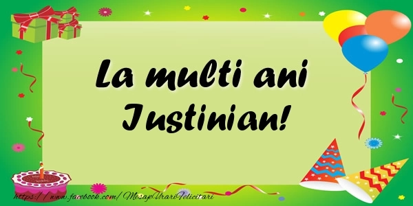 Această felicitare cu baloane, confetti și tort pe fundal verde din colecția noastră de felicitari de zi de nastere cu numele Iustinian are o notă de originalitate și îți oferă ocazia să faci o persoană să se simtă specială datorită faptului că acolo este numele ei. Felicitarea se poate descărca gratuit sau se poate trimite prin Whatsapp, Facebook, Twitter, Pinterest. Imagine de zi de nastere cu baloane, confetti și tort pe fundal verde cu dimensiunile 600px x 300px și cu textul La multi ani Iustinian!.