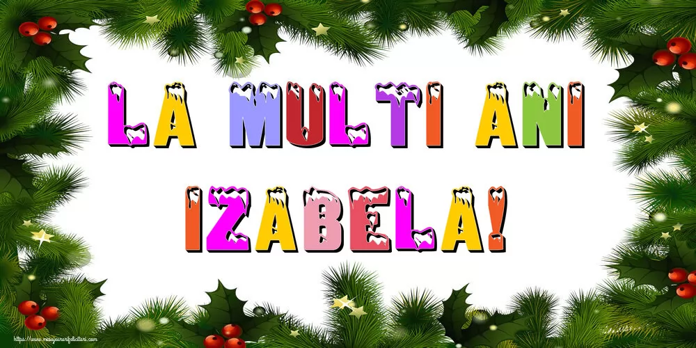 Descoperă cum numele Izabela devine sursa de lumină în acestă felicitare de Anul Nou. Fiecare literă aduce cu sine o strălucire distinctă, transformând această felicitare de Anul Nou cu chenar din brad de sărbători într-o operă plină de căldură și optimism.