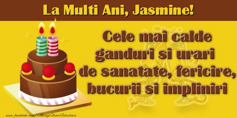 Această felicitare cu tort pentru femei sau bărbați din colecția noastră de felicitari de la multi ani cu numele Jasmine are o notă de originalitate și îți oferă ocazia să faci o persoană să se simtă specială datorită faptului că acolo este numele ei. Felicitarea se poate descărca gratuit sau se poate trimite prin Whatsapp, Facebook, Twitter, Pinterest. Imagine de la mulți ani cu tort pentru femei sau bărbați cu dimensiunile 800px x 400px și cu textul La multi ani, Jasmine!.