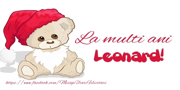Această felicitare cu ursuleț cu căciulă de moș din colecția noastră de felicitari de la multi ani cu numele Leonard are o notă de originalitate și îți oferă ocazia să faci o persoană să se simtă specială datorită faptului că acolo este numele ei. Felicitarea se poate descărca gratuit sau se poate trimite prin Whatsapp, Facebook, Twitter, Pinterest. Imagine de la mulți ani cu ursuleț cu căciulă de moș cu dimensiunile 600px x 300px și cu textul La multi ani Leonard!.