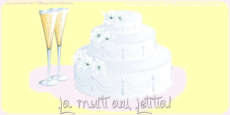 Această felicitare cu tort de frișcă și pahare de șampanie din colecția noastră de felicitari de zi de nastere cu numele Letitia are o notă de originalitate și îți oferă ocazia să faci o persoană să se simtă specială datorită faptului că acolo este numele ei. Felicitarea se poate descărca gratuit sau se poate trimite prin Whatsapp, Facebook, Twitter, Pinterest. Imagine de zi de nastere cu tort de frișcă și pahare de șampanie cu dimensiunile 800px x 400px și cu textul La multi ani, Letitia!.