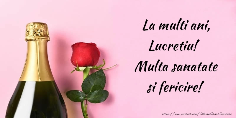 Această felicitare cu 1 trandafir și 1 șampanie din colecția noastră de felicitari de la multi ani cu numele Lucretiu are o notă de originalitate și îți oferă ocazia să faci o persoană să se simtă specială datorită faptului că acolo este numele ei. Felicitarea se poate descărca gratuit sau se poate trimite prin Whatsapp, Facebook, Twitter, Pinterest. Imagine de la mulți ani cu 1 trandafir și 1 șampanie cu dimensiunile 800px x 400px și cu textul La multi ani, Lucretiu! Multa sanatate si fericire!.