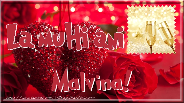 Felicitarea cu inimă și trandafiri pe fundal roz este ca o explozie de bucurie și culoare, iar numele Malvina este adăugat cu gingășie pentru a personaliza această experiență de sărbătoare. Este modul tău de a spune la mulți ani într-un mod unic și special!