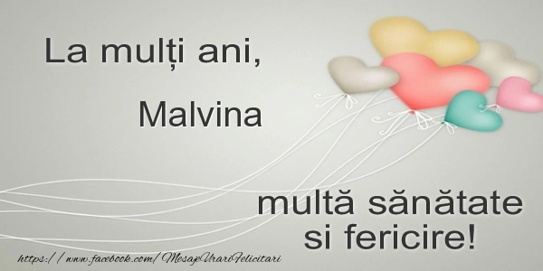Această felicitare cu baloane inimioare din colecția noastră de felicitari de la multi ani cu numele Malvina are o notă de originalitate și îți oferă ocazia să faci o persoană să se simtă specială datorită faptului că acolo este numele ei. Felicitarea se poate descărca gratuit sau se poate trimite prin Whatsapp, Facebook, Twitter, Pinterest. Imagine de la mulți ani cu baloane inimioare cu dimensiunile 600px x 300px și cu textul La multi ani, Malvina multa sanatate si fericire!.