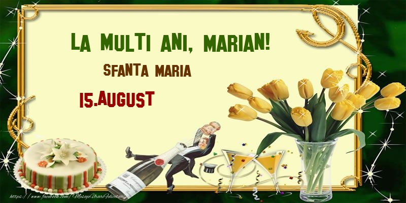 La multi ani, Marian! Sfanta Maria - 15.August | Felicitare cu lalele galbene, șampanie și tort | Felicitari de Ziua Numelui