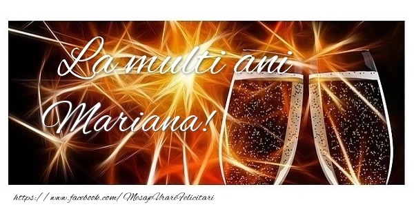 Însoțește aceste pahare cu o sticlă de șampanie selectă și creează momente de bucurie și entuziasm alături de cei dragi. Felicitarea cu pahare de șampanie și steluțe se poate descărca gratuit sau se poate trimite prin Whatsapp, Facebook, Twitter, Pinterest. Imaginea are dimensiunile 600px x 300px și textul La multi ani Mariana!.