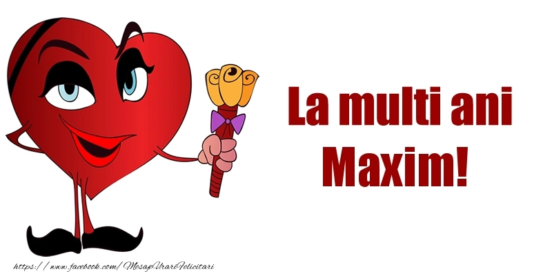 Felicitarea cu o inimoară haioasă cu un buchet în mână este ca o explozie de bucurie și culoare, iar numele Maxim este adăugat cu gingășie pentru a personaliza această experiență de sărbătoare. Este modul tău de a spune la mulți ani într-un mod unic și special!