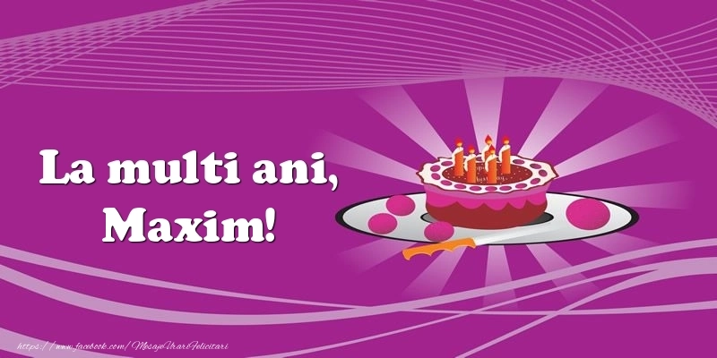 Cu un design atrăgător și plin de culoare, acestă felicitare specială cu numele Maxim îmbină elemente care să se potrivească gusturilor și preferințelor tuturor. Imaginea cu tort pentru fete sau băieți are dimensiunile 800px x 400px și textul La multi ani, Maxim!. Felicitarea cu se poate descărca gratuit sau se poate trimite prin Whatsapp, Facebook, Twitter, Pinterest.
