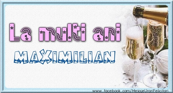 Această felicitare cu șampanie în pahare din colecția noastră de felicitari de zi de nastere cu numele Maximilian are o notă de originalitate și îți oferă ocazia să faci o persoană să se simtă specială datorită faptului că acolo este numele ei. Felicitarea se poate descărca gratuit sau se poate trimite prin Whatsapp, Facebook, Twitter, Pinterest. Imagine de zi de nastere cu șampanie în pahare cu dimensiunile 600px x 323px și cu textul La multi ani Maximilian.