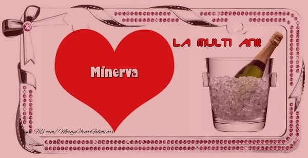 Această felicitare cu inimioară și șampanie în frapieră din colecția noastră de felicitari de la multi ani cu numele Minerva are o notă de originalitate și îți oferă ocazia să faci o persoană să se simtă specială datorită faptului că acolo este numele ei. Felicitarea se poate descărca gratuit sau se poate trimite prin Whatsapp, Facebook, Twitter, Pinterest. Imagine de la mulți ani cu inimioară și șampanie în frapieră cu dimensiunile 600px x 308px și cu textul La multi ani, Minerva!.