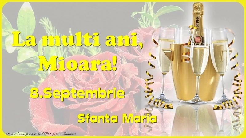 La multi ani, Mioara! 8.Septembrie - Sfanta Maria | Felicitare cu șampanie cu pahare pe fundal cu trandafiri roșii | Felicitari de Ziua Numelui