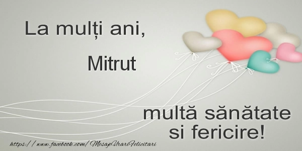 Această felicitare cu baloane inimioare din colecția noastră de felicitari de la multi ani cu numele Mitrut are o notă de originalitate și îți oferă ocazia să faci o persoană să se simtă specială datorită faptului că acolo este numele ei. Felicitarea se poate descărca gratuit sau se poate trimite prin Whatsapp, Facebook, Twitter, Pinterest. Imagine de la mulți ani cu baloane inimioare cu dimensiunile 600px x 300px și cu textul La multi ani, Mitrut multa sanatate si fericire!.