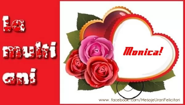 Această felicitare cu inimi și trandafiri din colecția noastră de felicitari de dragoste cu numele Monica are o notă de originalitate și îți oferă ocazia să faci o persoană să se simtă specială datorită faptului că acolo este numele ei. Felicitarea se poate descărca gratuit sau se poate trimite prin Whatsapp, Facebook, Twitter, Pinterest. Imagine de iubire cu inimi și trandafiri cu dimensiunile 600px x 342px și cu textul La multi ani Monica!.