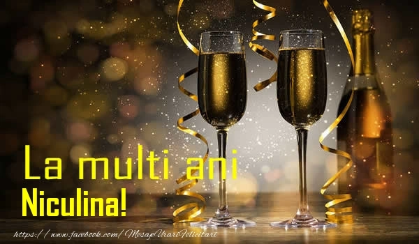 Felicitarea cu șampanie pe fundal cu auriu este ca o explozie de bucurie și culoare, iar numele Niculina este adăugat cu gingășie pentru a personaliza această experiență de sărbătoare. Este modul tău de a spune la mulți ani într-un mod unic și special!