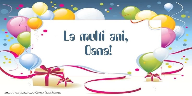 Celebrează ziua specială a cuiva drag pe nume Oana cu această felicitare plină de energie și culoare! Felicitarea cu baloane colorate și cadouri se poate descărca gratuit sau se poate trimite prin Whatsapp, Facebook, Twitter, Pinterest. Imaginea are dimensiunile 800px x 400px și textul La multi ani, Oana!.