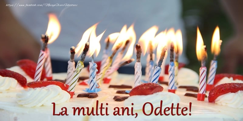 Această felicitare cu lumânări pe tort din colecția noastră de felicitari de zi de nastere cu numele Odette are o notă de originalitate și îți oferă ocazia să faci o persoană să se simtă specială datorită faptului că acolo este numele ei. Felicitarea se poate descărca gratuit sau se poate trimite prin Whatsapp, Facebook, Twitter, Pinterest. Imagine de zi de nastere cu lumânări pe tort cu dimensiunile 800px x 400px și cu textul La multi ani Odette!.