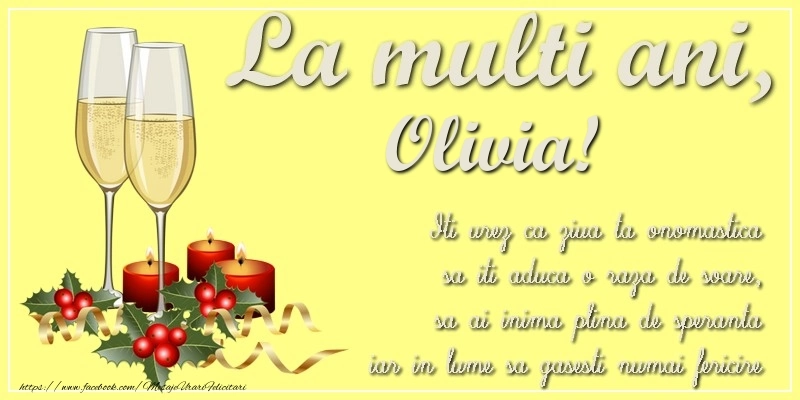 La multi ani, Olivia! Iti urez ca ziua ta onomastica sa iti aduca o raza de soare, sa ai inima plina de speranta iar in lume sa gasesti numai fericire