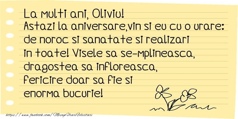 Felicitarea cu floricele și un mesaj frumos este ca o explozie de bucurie și culoare, iar numele Oliviu este adăugat cu gingășie pentru a personaliza această experiență de sărbătoare. Este modul tău de a spune la mulți ani într-un mod unic și special!