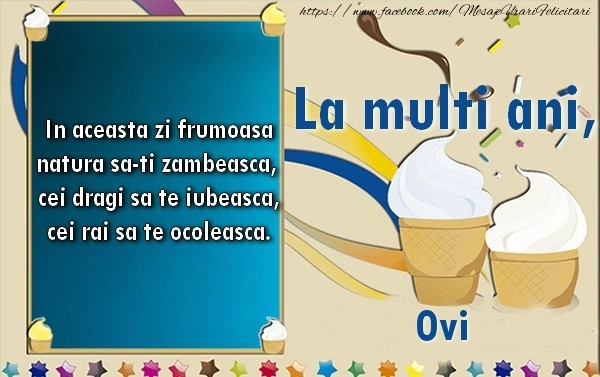 Felicitarea cu prăjiturele este ca o explozie de bucurie și culoare, iar numele Ovi este adăugat cu gingășie pentru a personaliza această experiență de sărbătoare. Este modul tău de a spune la mulți ani într-un mod unic și special!