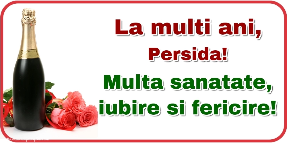 Felicitarea cu trandafiri și șampanie pe fundal alb cu chenar roșu este ca o explozie de bucurie și culoare, iar numele Persida este adăugat cu gingășie pentru a personaliza această experiență de sărbătoare. Este modul tău de a spune la mulți ani într-un mod unic și special!