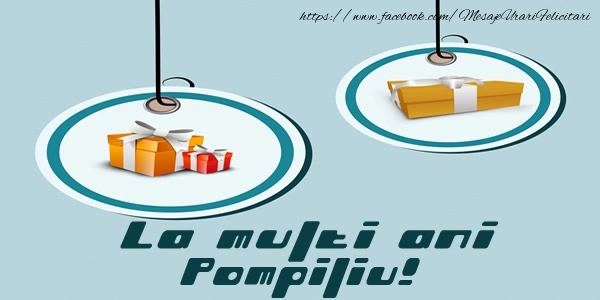 Felicitarea cu cadouri, cadouri este ca o explozie de bucurie și culoare, iar numele Pompiliu este adăugat cu gingășie pentru a personaliza această experiență de sărbătoare. Este modul tău de a spune la mulți ani într-un mod unic și special!