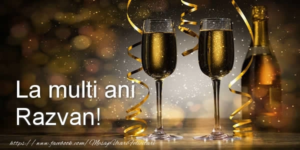 Imaginează-ți o sticlă strălucitoare de șampanie, gata să fie deschisă pentru a sărbători ziua specială a destinatarului. Cu bulele sale strălucitoare și eticheta festivă, această sticlă de șampanie este simbolul perfect al bucuriei și sărbătorii. Alegeți să aduceți un strop de fericire în viața destinatarului cu această felicitare cu numele Razvan, care va fi cu siguranță apreciată și iubită! Felicitarea se poate descărca gratuit sau se poate trimite prin Whatsapp, Facebook, Twitter, Pinterest. Imaginea are dimensiunile 600px x 300px și textul La multi ani Razvan!.