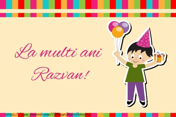 Această felicitare cu copil cu baloane și cadou din colecția noastră de felicitari de zi de nastere cu numele Razvan are o notă de originalitate și îți oferă ocazia să faci o persoană să se simtă specială datorită faptului că acolo este numele ei. Felicitarea se poate descărca gratuit sau se poate trimite prin Whatsapp, Facebook, Twitter, Pinterest. Imagine de zi de nastere cu copil cu baloane și cadou cu dimensiunile 600px x 400px și cu textul La multi ani Razvan!.